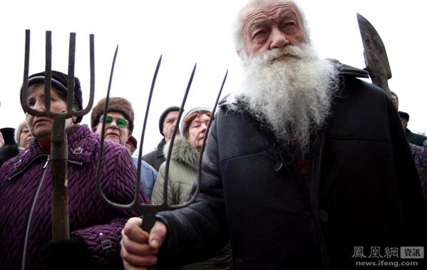 当地时间11月28日,乌克兰顿涅茨克,老年人手持铁叉在行政大楼前抗议政府增加税收。 (责任编辑:admin)